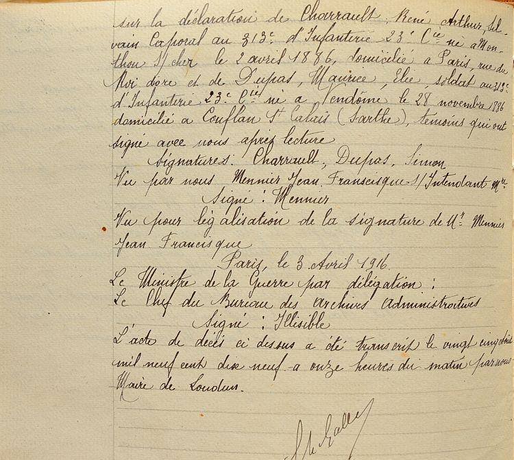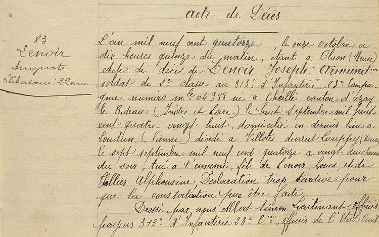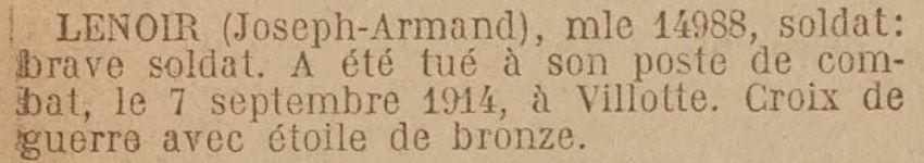 Tué à l'ennemi à Villote devant Louppy (Meuse) le 7 Septembre 1914 (Certificat du Lt Colonel Commandant le 313e Régiment d'Infanterie en date du 24 Mars 1915).