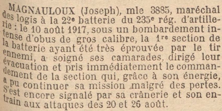 Ordre de l'Armée N° 932 du 8 Octobre 1917 'Le 10 Août 1917, sous un bombardement intense d'obus de gros calibre, la 1ère section de la batterie ayant été très éprouvée par le tir ennemi, a soigné ses camarades, dirigé leur évacuation et pris immédiatement le Commandement de la Section, qui grâce à son énergie, a pû continuer sa mission malgré la perte des 2/3 de son effectif, s'est encore signalé par sa crânerie et son entrain aux attaques des 20 et 26 Août'.