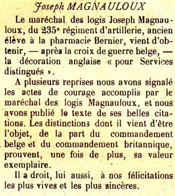 Cité à l'ordre du Corps d'Armée du 1er Juin 1915 'Les 9 et 10 Mai, détaché à 2 reprises comme éclaireur d'objectif dans une tranchée de 1ère ligne, a rempli sa mission avec courage et sang-froid. A été grièvement blessé à son poste'.