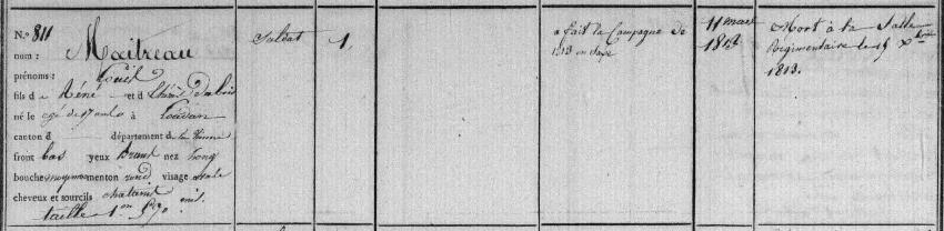Soldat au Bataillon d'ouvriers d'administration, 1ère compagnie à partir du 11 Mars 1813. A fait la campagne de 1813 en Saxe. Mort à la Salle Régimentaire le 19 Décembre 1813.