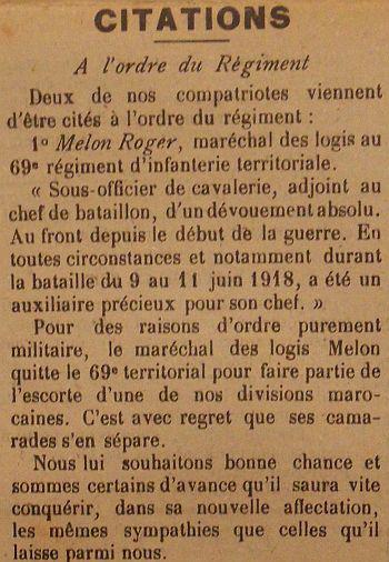 A l'ordre du Régiment "Sous-officier de cavalerie adjoint au chef de Bataillon d'un dévouement absolu au front depuis le début de la guerre. En toutes circonstances et notamment durant la bataille du 9 au 11 juin 1918 a été un auxiliaire précieux pour son chef".