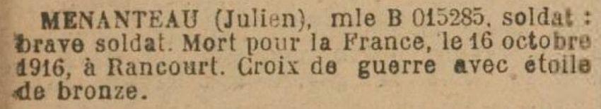 Tué à l'ennemi à Rancourt ( Somme ) le 16 Octobre 1916 ( Avis officiel HL 1320 du 14 Novembre 1916).