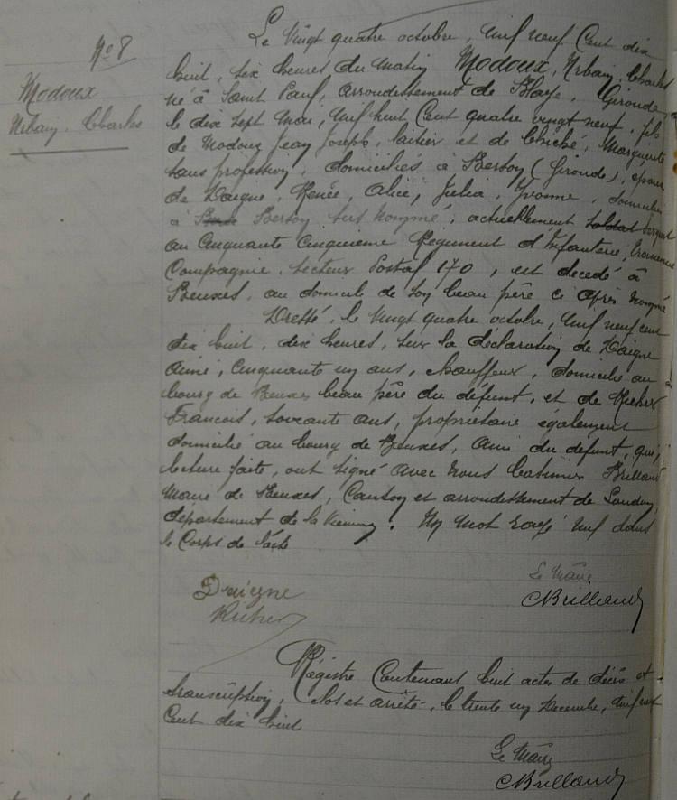 Décédé le 24 Octobre 1918 dans ses foyers - Avis de décès de la mairie de Beuxes en date du 1 Décembre 1919.