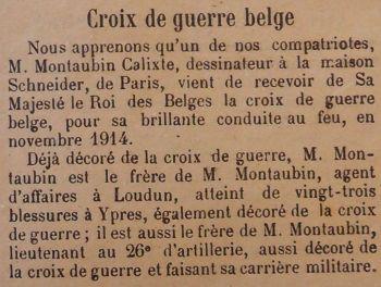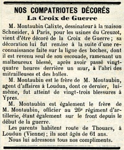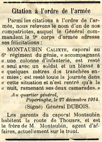 Cité à l'ordre du C.A. le 27 Décembre 1914 (Croix de Guerre étoile de Vermeil) 'Accompagnant une colonne d'infanterie, est resté seul avec un soldat et un blessé à quelques mètres des tranchées ennemies; est resté toute la journée dans cette situation et n'est rentré qu'à la nuit ramenant ses deux camarades'.