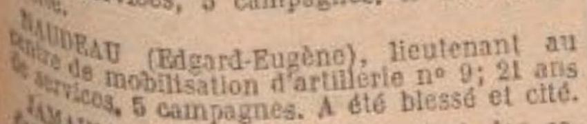 Citation. Ordre du régiment du 29 Septembre 1915. 'Blessé à son poste le 30 Octobre 1914, après un pansement sommaire, est revenu reprendre le commandement de sa pièce'.