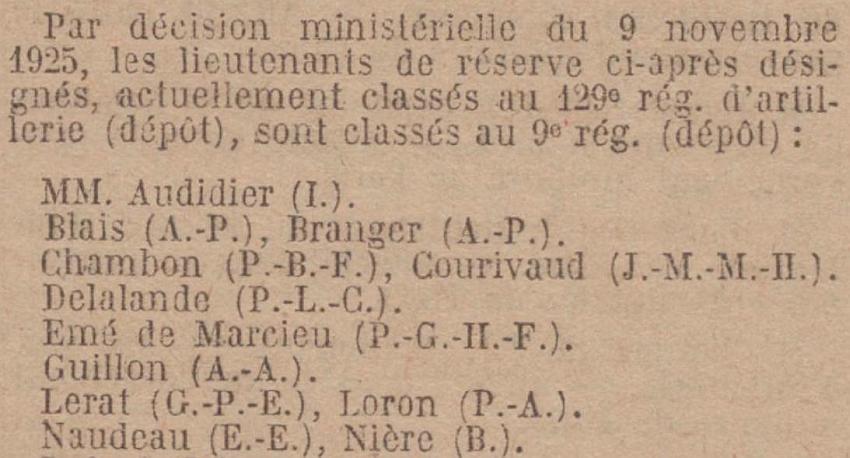 Affecté au 9e Régiment d'Artillerie par Décision Ministérielle du 9 Novembre 1925. J.O. du 11.