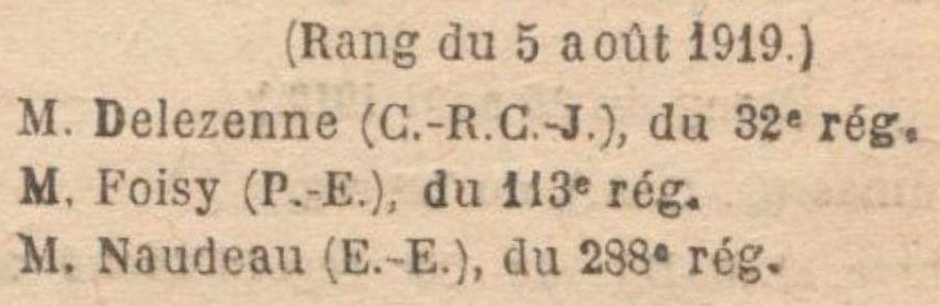 Promu Lieutenant à titre temporaire par Décision Ministérielle du 28 Décembre 1918 (rang du 30 Novembre 1918).