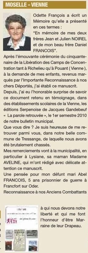 Réfugiée à Pouant, Mme Odette François, née Noirel, raconte dans un manuscrit dédié à ses enfants, l’effroyable nuit d’épouvante qu’elle a vécue aux premières heures du 19 janvier 1944. Ses frères, Julien et Jean, sont arrêtés et ne reviendront pas de la déportation. « La nuit, dès les premières heures de ce 19 janvier pluvieux et glacial, à 5 heures du matin, par une forte tempête de vent et de pluie, on entendit un vacarme effroyable dans la cour : des Allemands pénétraient sans ménagement dans la maison. Mme Bassereau, en chemise de nuit, pieds nus, entourée des hommes de la Gestapo, avait eu juste le temps de passer une cape sur ses épaules. « Les uns s’introduisaient directement dans la chambre de mes parents, les obligeant à se tourner le dos. C’était alors le questionnaire auquel ils ne pouvaient apporter aucune réponse. Maman de leur poser à maintes reprises : “Mon fils ? Qu’avez-vous fait de mon fils ? Qu’en avez-vous fait ?” Eux de répliquer sèchement : “Répondez aux questions !”… « Une sentinelle, à la porte, gardait la chambre. Maman nous expliqua par la suite que, remarquant son angoisse, le soldat essaya avec compassion de la rassurer en lui disant : “Si votre fils n’a fait que des faux papiers, cela va s’arranger.” Pendant ce temps-là, Mme Bassereau subissait l’interrogatoire des autres dans le couloir, battue par ces brutes. C’était d’une voix plutôt douce et résignée que nous l’entendions répondre : “Non… Je ne sais pas ou je ne connais pas.” À chaque réponse, les coups tombaient. Une simple cloison séparait le couloir de la pièce où nous dormions, ma sœur et moi ; ce qui fit de nous les témoins de ces faits. »