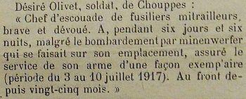 Cité à l'ordre du Régiment N° 27 du 14 Juillet 1917 'Chef d'escouade de F.M. brave et dévoué, a pendant 6 jours et 6 nuits malgré le bombardement qui se faisait sur son emplacement assuré le service de son arme d'une façon exemplaire, période du 3 au 10 Juillet 1917. Au front depis 25 mois'.