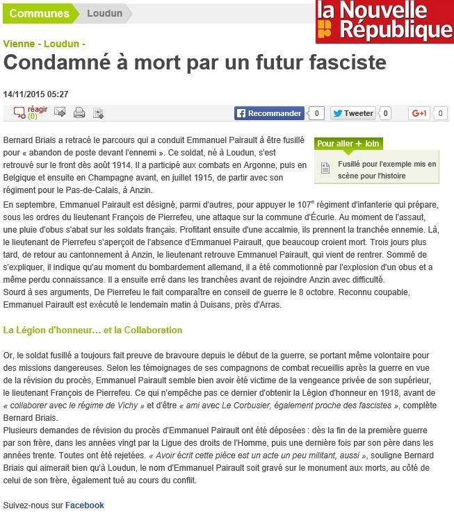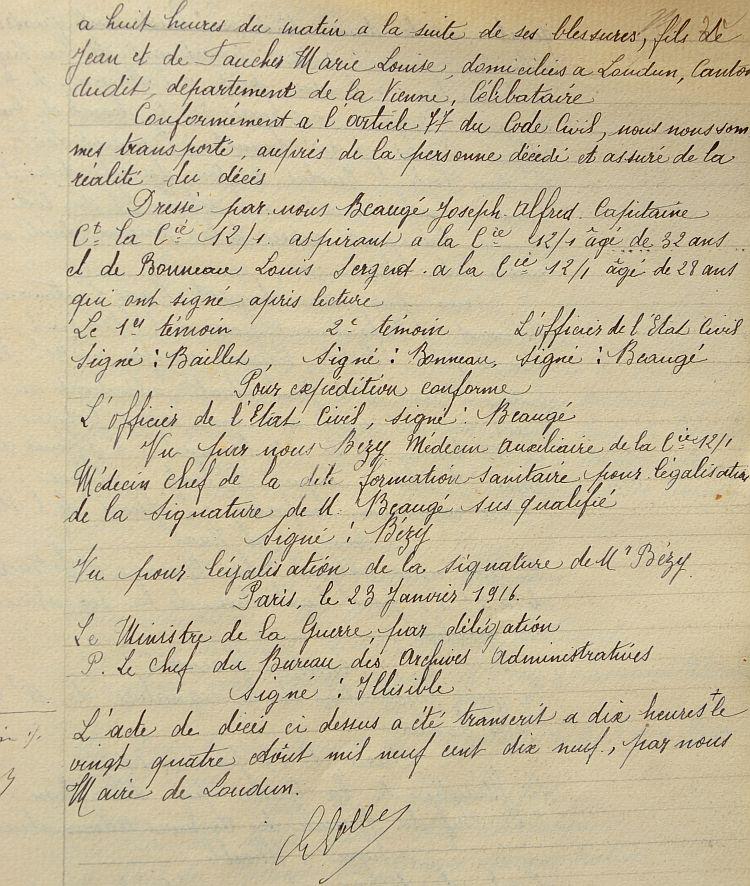 Condamné à la peine de mort par le conseil de guerre de la 23e Division séant en campagne du 8 octobre 1915 pour coupable d'abandon de poste en présence de l'ennemi. Le jugement a été exécuté le 9 octobre 1915 à 8 heures à Duisans (Pas de Calais).