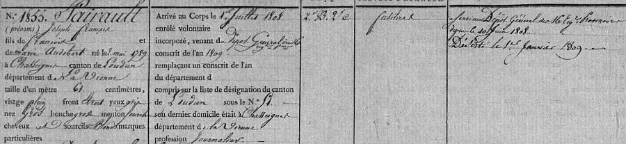 Conscrit de l'an 1809. Fusilier au 118e régiment d'infanterie de ligne, 2e Bataillon, 2e Compagnie. Arrivé au Corps le 1er Juillet 1808. A servi au Dépôt Général du 16e Régiment Provisoire depuis le 10 Juin 1808. Déserté le 1er Janvier 1809.