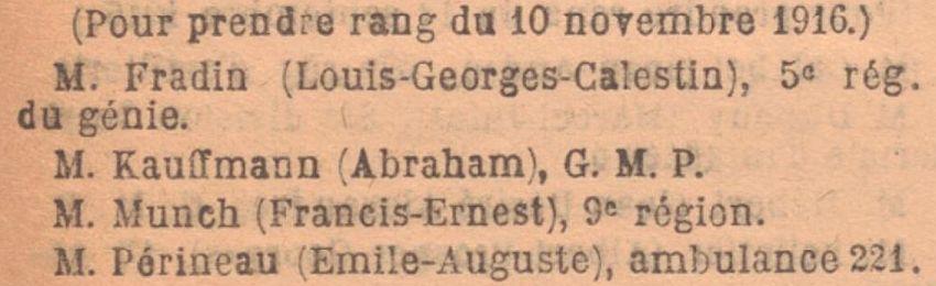 Promu médecin aide major de 2ème classe de Tale pour la durée de la guerre par décision ministérielle du 10 Novembre 1914. J.O. du 16 Novembre et affecté par Décision du Directeur du service de santé de la 9ème Région à l'Hôpital Temporaire N° 21 à Poitiers.