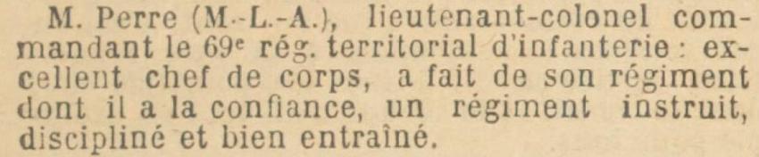 "Excellent chef de Corps a fait de son régiment, dont il a la confiance, un régiment instruit, discipliné et entraîné".