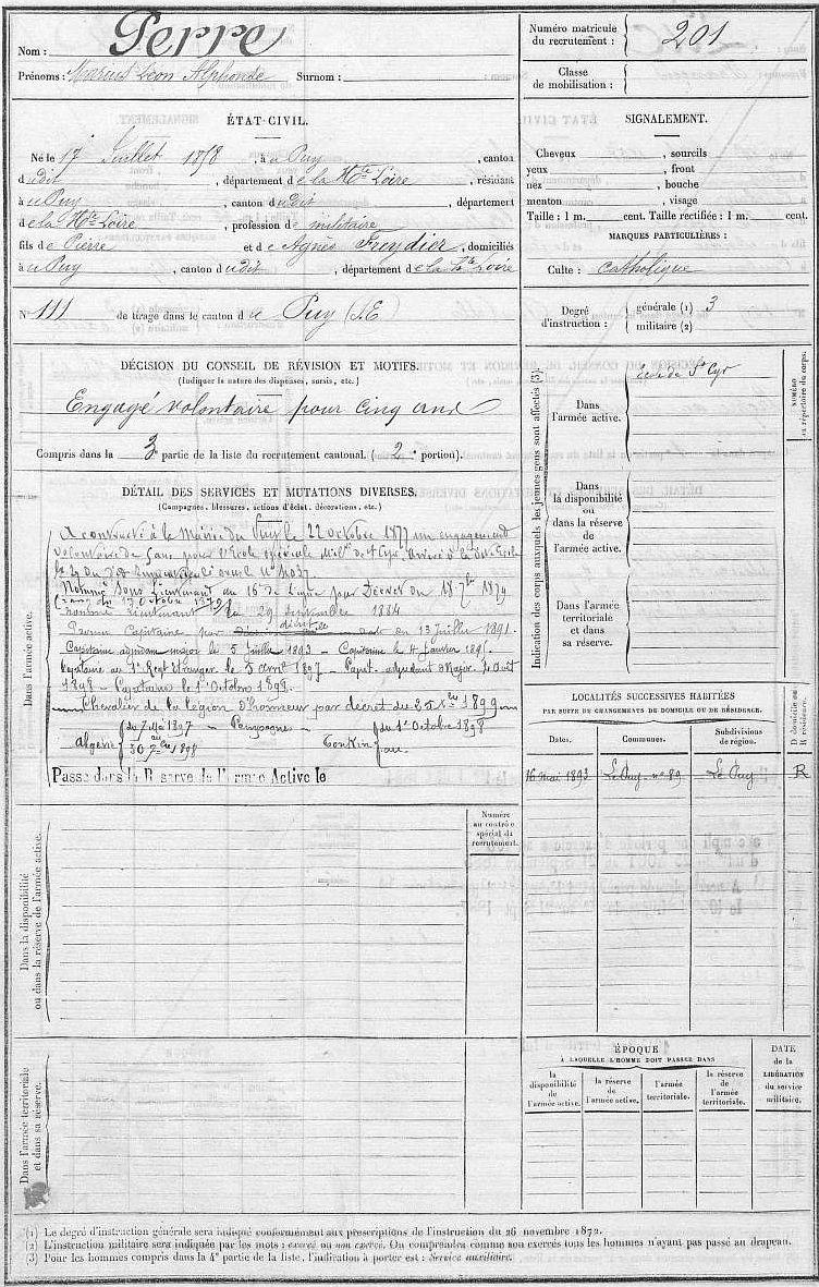 Engagé volontaire pour 5 ans le 22 Octobre 1877 dans la subdivision du Puy. Mle au Recrutement 111.