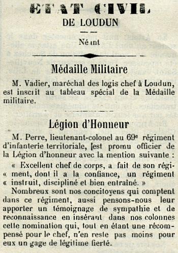 A reçu le 28 février 1885 une lettre de félicitations du Ministre de la Guerre pour le soin et l'habileté qu'il a mis à exécuter son travail à la Brigade topographique en 1884.