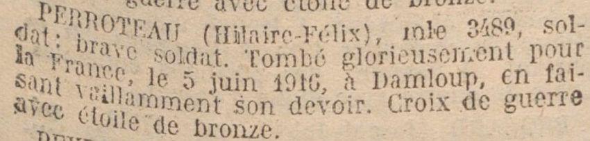 Tué à l'ennemi le 5 Juin 1916 à Damloup (Meuse). Avis officiel FX 2350 du 20 Juin 1916.
