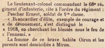 Citation à l'ordre du régiment n° 85 du 7 septembre 1918 "Brancardier d'élite très brave exemple de courage et de dévouement. S'est distingué le 23Août 1918 en cherchant les blessés sous le feu de l'ennemi".