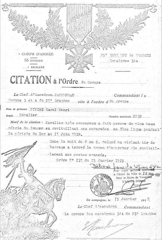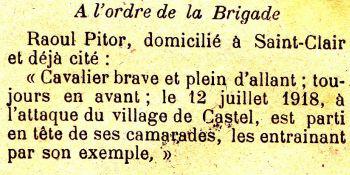 Cité à l'ordre de la Brigade (68 B.C.1) 'Cavalier brave et plein d'allant toujours en avant, le 12 Juillet 1918, à l'attaque du village de Castel est parti en tête de ses camarades les entaînant par son exemple'.