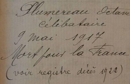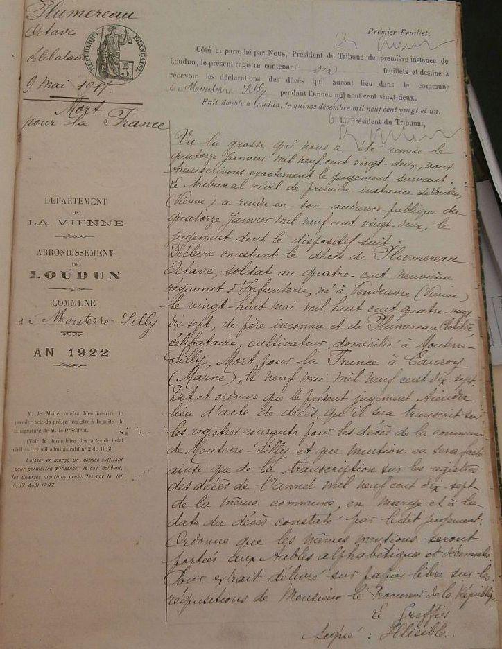 Décès fixé au 9 Mai 1917 d'après jugement déclaratif rendu par le Tribunal de Loudun en date du 14 Janvier 1922.