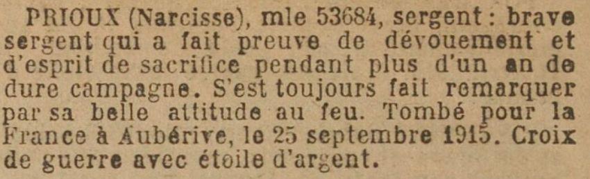 Citation : Cité à l'ordre de la Brigade du 16 février 1915 - Excellents services et belle conduite au feu depuis le début de la campagne.