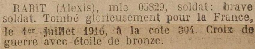 Tué le 1er Juillet 1916, Côte 304 (avis officiel Ministère de la Guerre G.G. 1812 - 25 Juillet 1916).