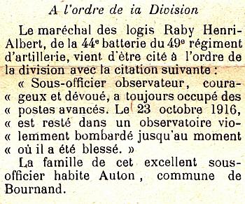 2° Cité à l'ordre du Régiment n° 69 du 30 Octobre 1916, 'Sous-officier observateur courageux et dévoué a toujours occupé des postes avancés. Le 23 octobre 1916 est resté dans un observatoire violemment bombardé jusqu'au moment où il a été blessé'. Perte de l'œil droit.