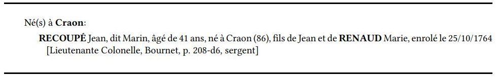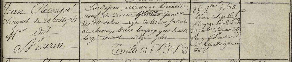 RECOUPÉ Jean, dit Marin, âgé de 41 ans, né à Craon (86), Fils de Jean et de METAIS Marie, enrolé le 25/10/1764