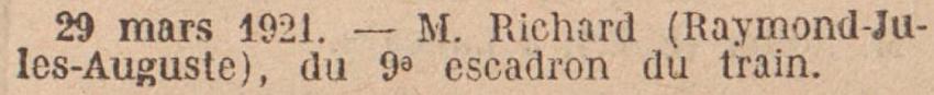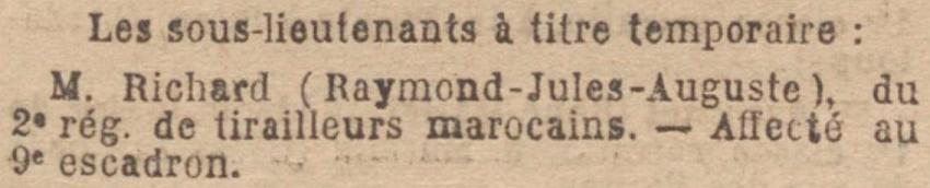 Versé dans le cadre des officiers au C.E.M. et affecté au 2e Régiment de Mitrailleurs au 9e Escadron du TE.M. par D.M. du 7 Mai 1921 (J.O. du 11 Mai 1921).