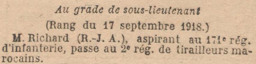 Promu Sous-Lieutenant à Titre Temporaire à dater du 17 Septembre 1918 (J.O. du 17 Novembre 1918).