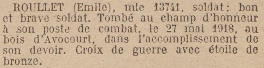 Tué à l'ennemi le 27 Mai 1918 au Sud du Bois d'Avovourt. Avis officiel E.P.bis 10556G du 12 Juin 1918.