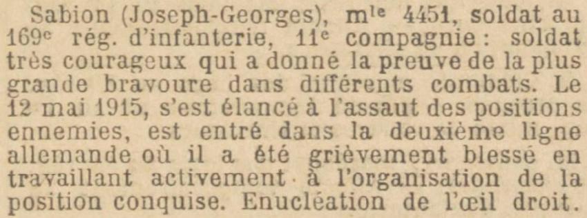 Croix de Guerre avec palme 'Soldat très courageux qui a donné la preuve de la plus grande abnégation et bravoure dans différents combats. Le 12 mai 1915 s'est élancé à l'assaut des positions ennemies est entré dans la 2e ligne allemande où il a été grièvement blessé en travaillant activement à l'organisation de la position conquise. Énucléation de l'œil droit.'.