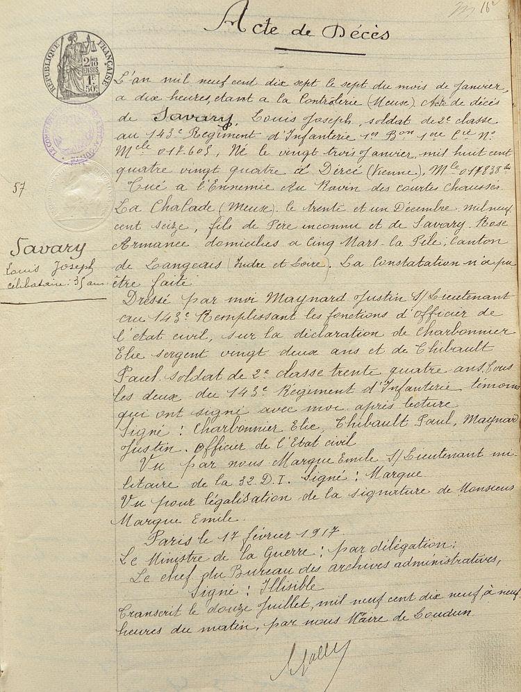 Rappelé à l'activité le 4 août 1914 (Décret de mobilisation générale du 1er Août 1914). Arrivé au corps le dit jour. Inapte un mois, Commission de réforme de Tours du 14 Juin 1916 pour 'éclat d'obus dos du 2e orteil gauche'. Passé au 143e Régiment d'Infanterie le 19 Septembre 1916 (Téleg. 7734 R de la 9e région du 15 septembre 1916). Mort pour la France le 31 décembre 1916 au ravin des Courtes Chausses La Chalade (Meuse) (JMO 143e RI 31 Décembre 1916 ) avis officiel du ministère de la guerre E.T. bis 550 4 du 20 Janvier 1917.