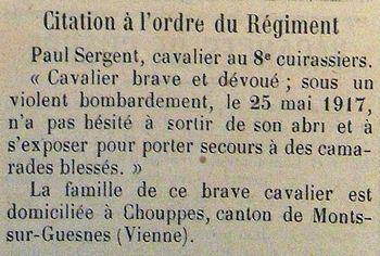 Cité à l'ordre du Régiment N° 80bis du 14 Juin 1917 'Cavalier brave et dévoué sous un violent bombardement le 28 Mai 1917 n'a pas hésité à sortir de son abri et à s'exposer pour porter secours à des camarades blessés.'.