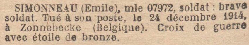 Tué à l'ennemi le 24 décembre 1914 au combat de Zonnebeck (Belgique).