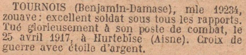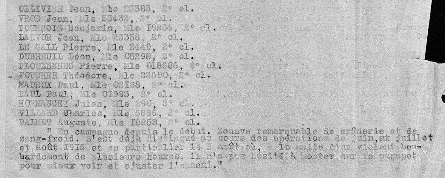 Cité à l'ordre du Régiment n° 81 du 29 août 1916. En campagne depuis le début. Zouave remarquable de crânerie et de sang froid s'est déjà distingué au cours des opérations de juin, juillet et août 1916 et en particulier le 5 août où à la suite d'un violent bombardement de plusieurs heures il n'a pas hésité à monter sur le parapet pour mieux voir et ajuster l'ennemi.