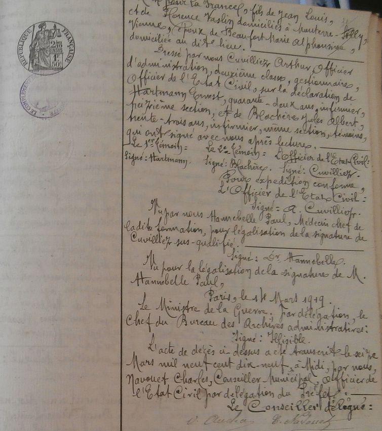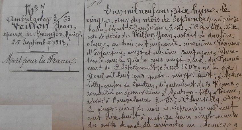 Décédé le 25 Septembre 1918 à l'Ambulance 3/63 de Chantilly (avis Mel CB 21085 du 25 Novembre 1918).