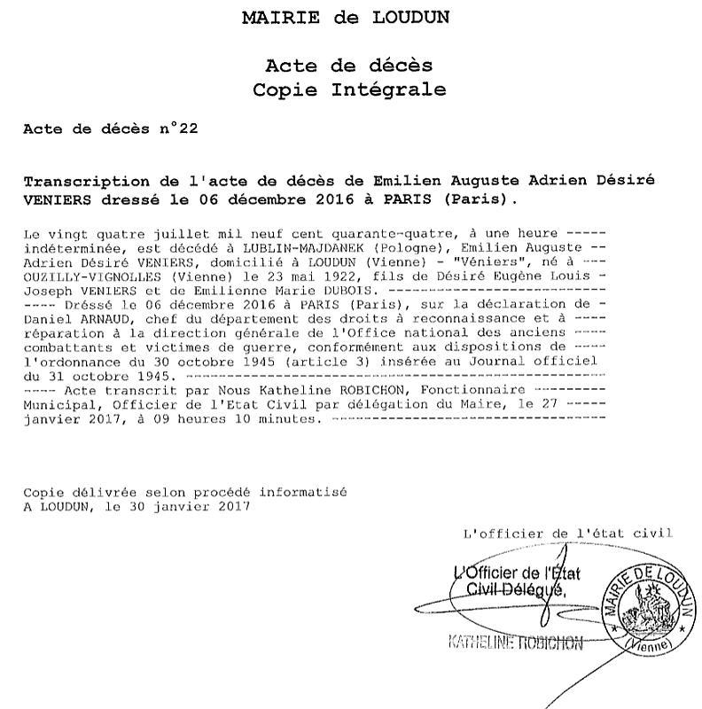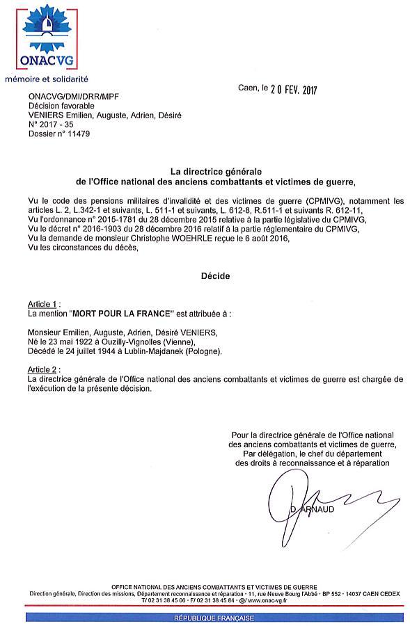 En consultant son dossier aux archives des victimes des conflits contemporains de Caen, quelle ne fut pas ma surprise de constater que son dossier porte la mention: "N'a pas droit à la mention Mort en déportation", décision prise le 18 décembre 2000 !, soit 56 ans après son décès. Le 25 Mai 1950 suite à un acte de disparition établi le 30 août 1947 à la demande de DUBOIS Cyriaque (grand-père et tuteur) de Ranton dans la Vienne, la Direction du Contentieux de l'État-civil et des recherches rend compte au notaire de Loudun, Monsieur Lucien Boillot, qu'aucune indication n'est connue sur le sort du déporté Véniers.