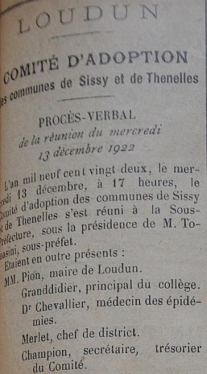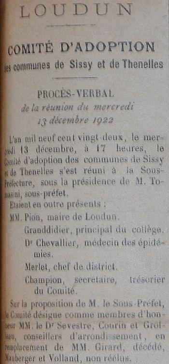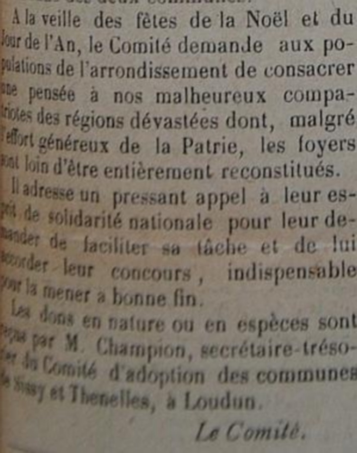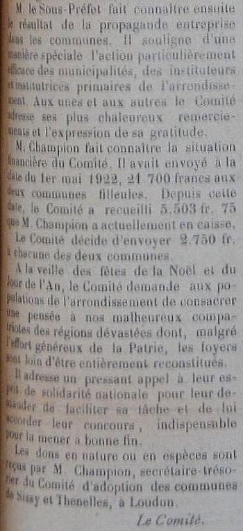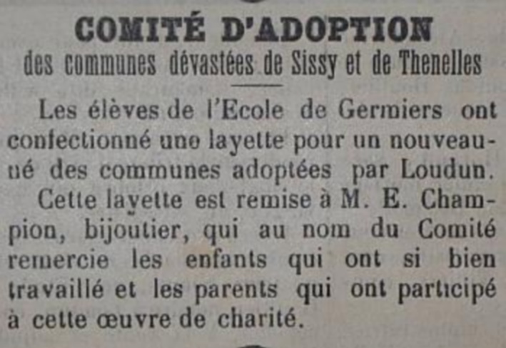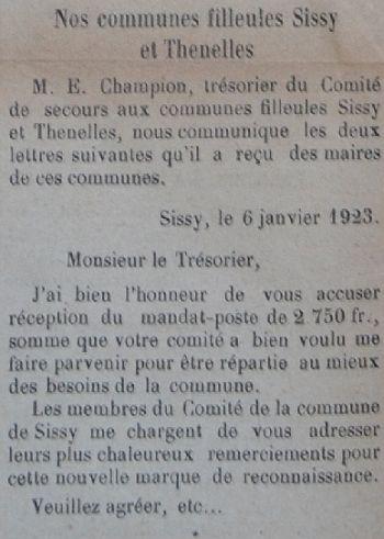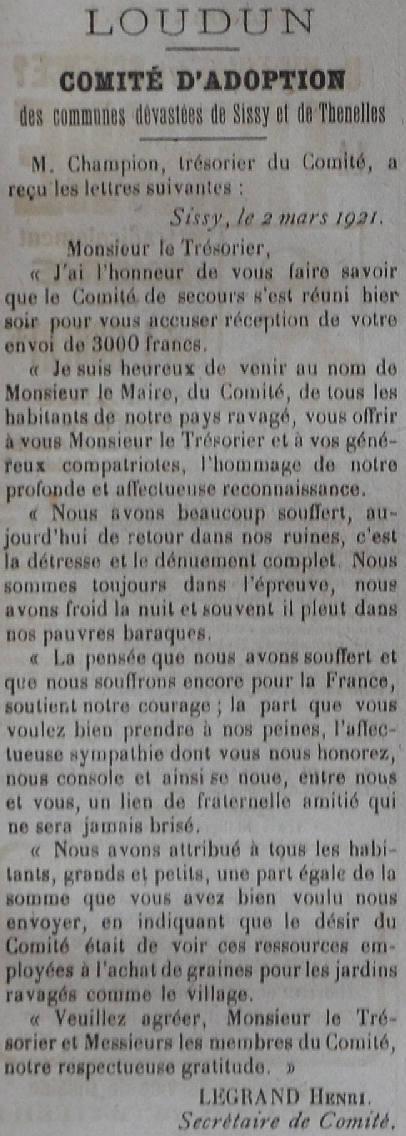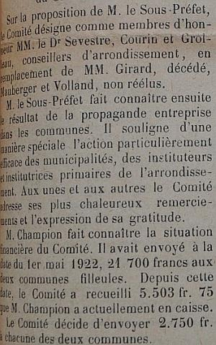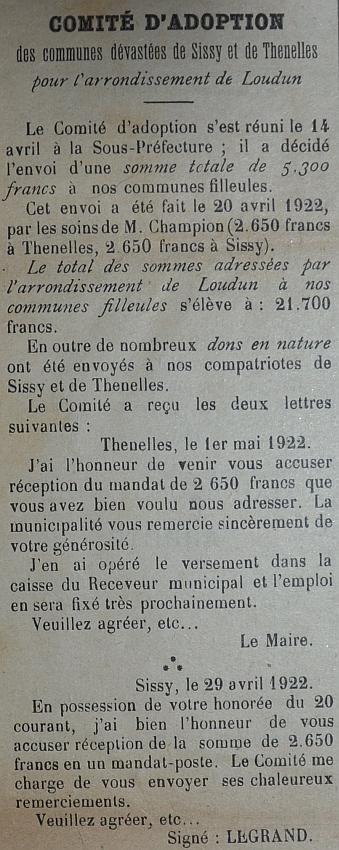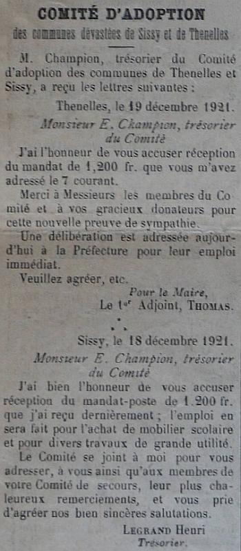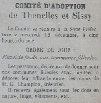 Le programme d'adoption des communes dévastées par la guerre (donc pas seulement dans l'Aisne) a été lancé par l'Union des Grandes Associations Françaises pour l'Essor National en juin 1920 et se met en place en 1921.